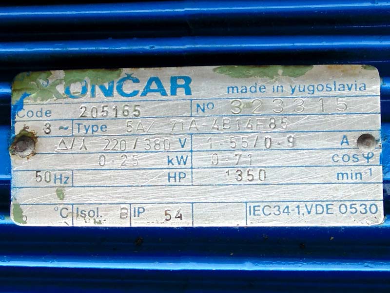Мощность двигателя: 0,25 кВт, скорость 1350 об/мин.